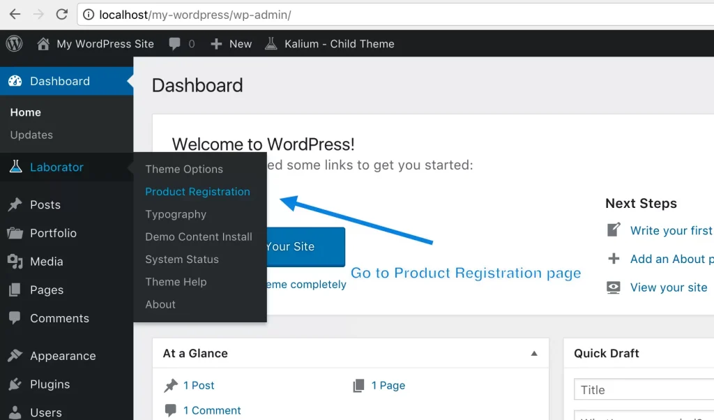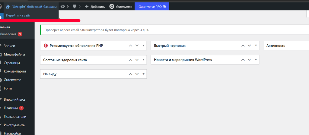 WordPress админ панеліне кіргенде, басты бетті көресіз.